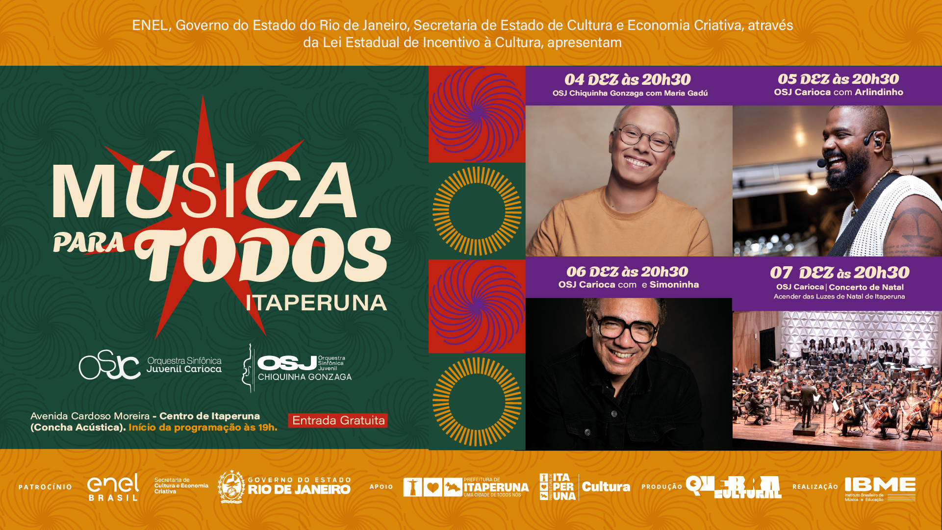 A entrada é gratuita e a programação tem início às 19h. O evento é realizado pelo IBME, com patrocínio da ENEL Distribuição Rio e do Governo do Estado do Rio de Janeiro e da Secretaria de Estado de Cultura e Economia Criativa.